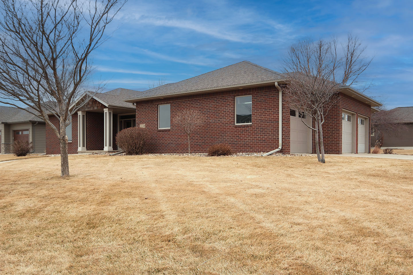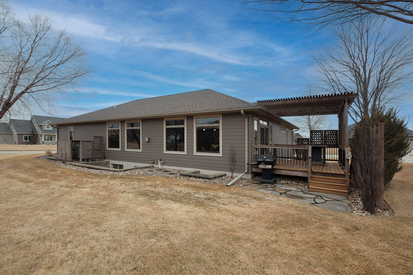 Positioned gracefully along The Ridge Golf Course, this custom-built residence is a masterclass in timeless architecture and intentional design — a home where every space feels thoughtfully composed. Rich textures and moody tones create a warm, resonant atmosphere, blending sophistication with comfort in perfect harmony. Expertly crafted knotty alder custom cabinetry anchors the home like a steady rhythm section — both striking and highly functional. Each room unfolds with balance and flow, reflecting interior excellence and careful orchestration, accenting the double-sided gas fireplace. The main level features a serene primary suite retreat with natural light, while a private guest suite offers a versatile encore — ideal for refined hosting, a home office, or even a boutique-style studio space with additional access. The lower level expands the composition with an open-concept design that invites gathering and connection. Three additional bedrooms, a full bath, expansive walk-in closets, and abundant storage ensure that every note of practicality is met. Outside, the architectural presence makes a bold first impression. A distinguished brick façade paired with cedar shake accents creates depth and character, while the pergola-covered deck sets the stage for intimate evenings under the sky. Overlooking the manicured beauty of the course, this outdoor retreat offers the perfect backdrop for entertaining or quiet reflection. With breathtaking views, curated details, and a layout that flows effortlessly from one space to the next, this residence is a true symphony of craftsmanship and design — refined living at its finest!