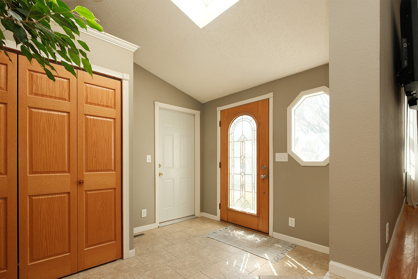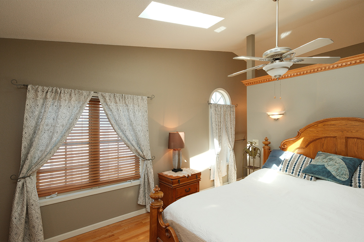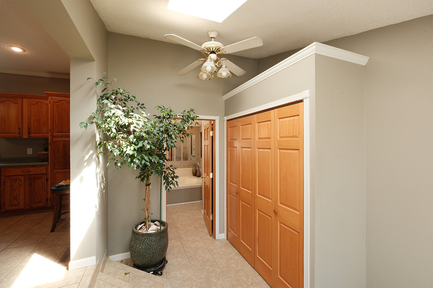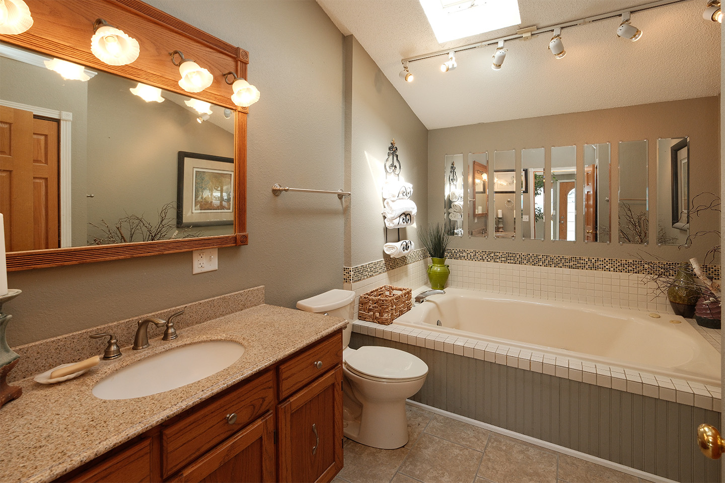 The main floor features beautiful oak flooring, abundant natural light from multiple skylights, and a spacious kitchen with solid oak cabinetry and room to add an island. The guest bathroom includes a large whirlpool tub, perfect for relaxing at the end of the day.